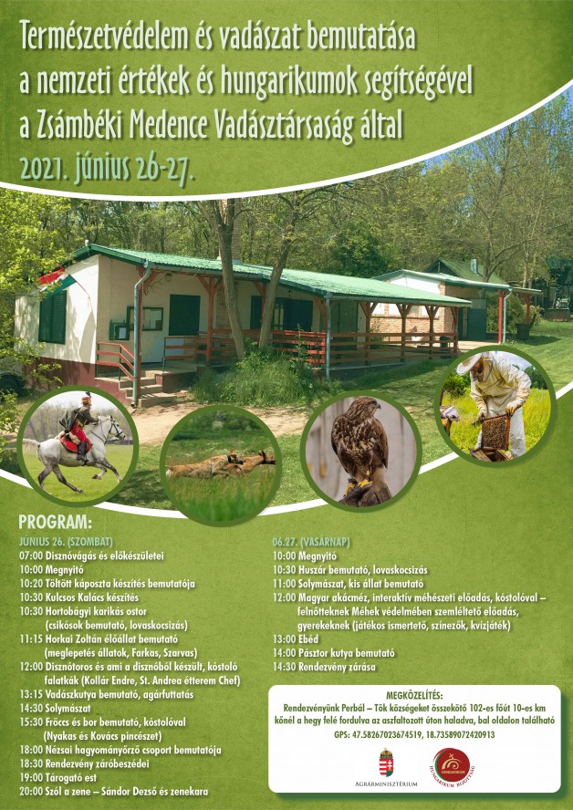 2021. június 26-án és 27-én a természetvédelem és a vadászat kapcsolatát mutatja be a nemzeti értékek és hungarikumok segítségével a Zsámbék Medence Vadásztársaság.