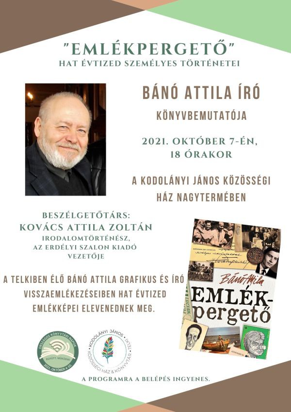 Az Országos Könyvtári Napok keretében Bánó Attila könyvbemutatójára hívjuk az érdeklődőket a Kodolányi János Közösségi Ház és Könyvtárba. A szerzővel legújabb könyvéről az Erdélyi Szalon Kiadó vezetője, Kovács Attila Zoltán irodalomtörténész beszélget.