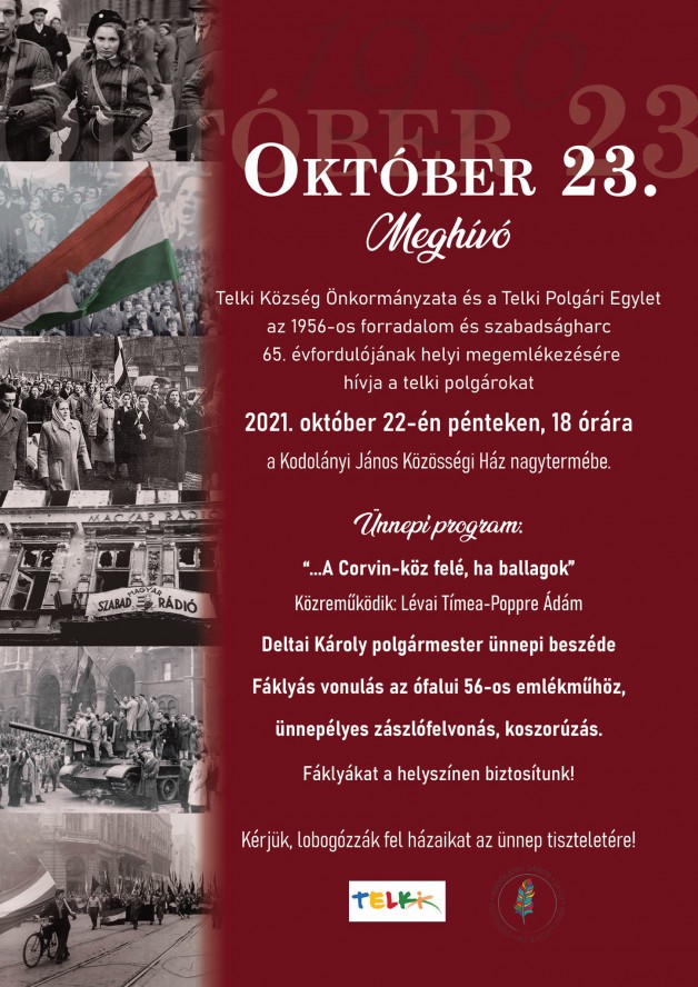 Telki Község Önkormányzata, valamint a Telki Polgári Egylet az 1956-os forradalom és szabadságharc 65. évfordulójának helyi megemlékezésére hívja a telki polgárokat 2021. október 22-én, pénteken 18 órakor a Kodolányi János Közösségi Házba, majd az ófalui 56-os emlékműhöz.